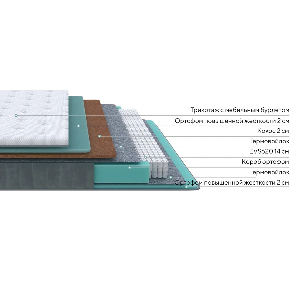 Упругая текстура латексированного кокосового волокна в составе придает необходимую жесткость, усиливая поддержку позвоночника. Объемный трикотажный чехол с волокнами вискозы подарит нежные ощущения. Матрас изготовлен по особой технологии — не нужно ежесезонно переворачивать.