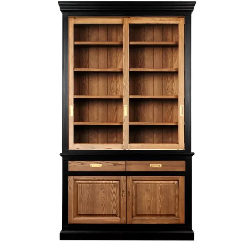 Двухсекционная витрина с откатными дверцами выполнена из массива березы (гладкая фактура) или шпона ясеня (с фактурой дерева), комбинированный выкрас в эмали черного или белого цвета.
